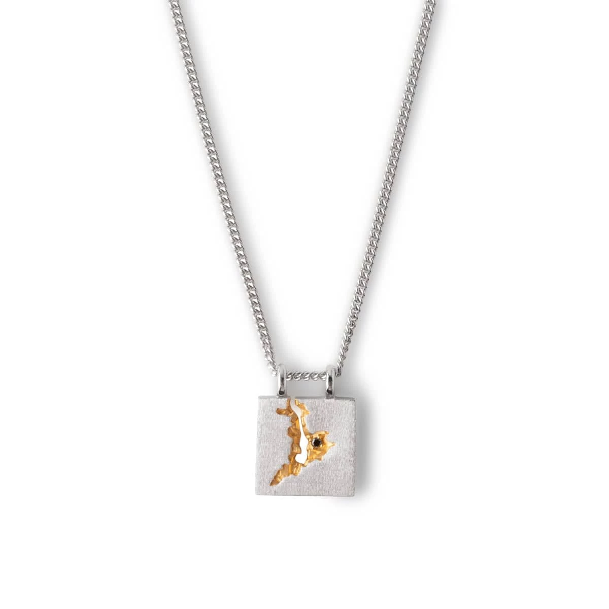 Inspired by the rocky coastline of Norway against the clean surface of the silver ocean, The Mined Pendant leaves a rawness to our classic pendants. The rough groove with a handset black diamond reminds us of the beach flowers that grow inside the rock slopes, leading down to the sea.